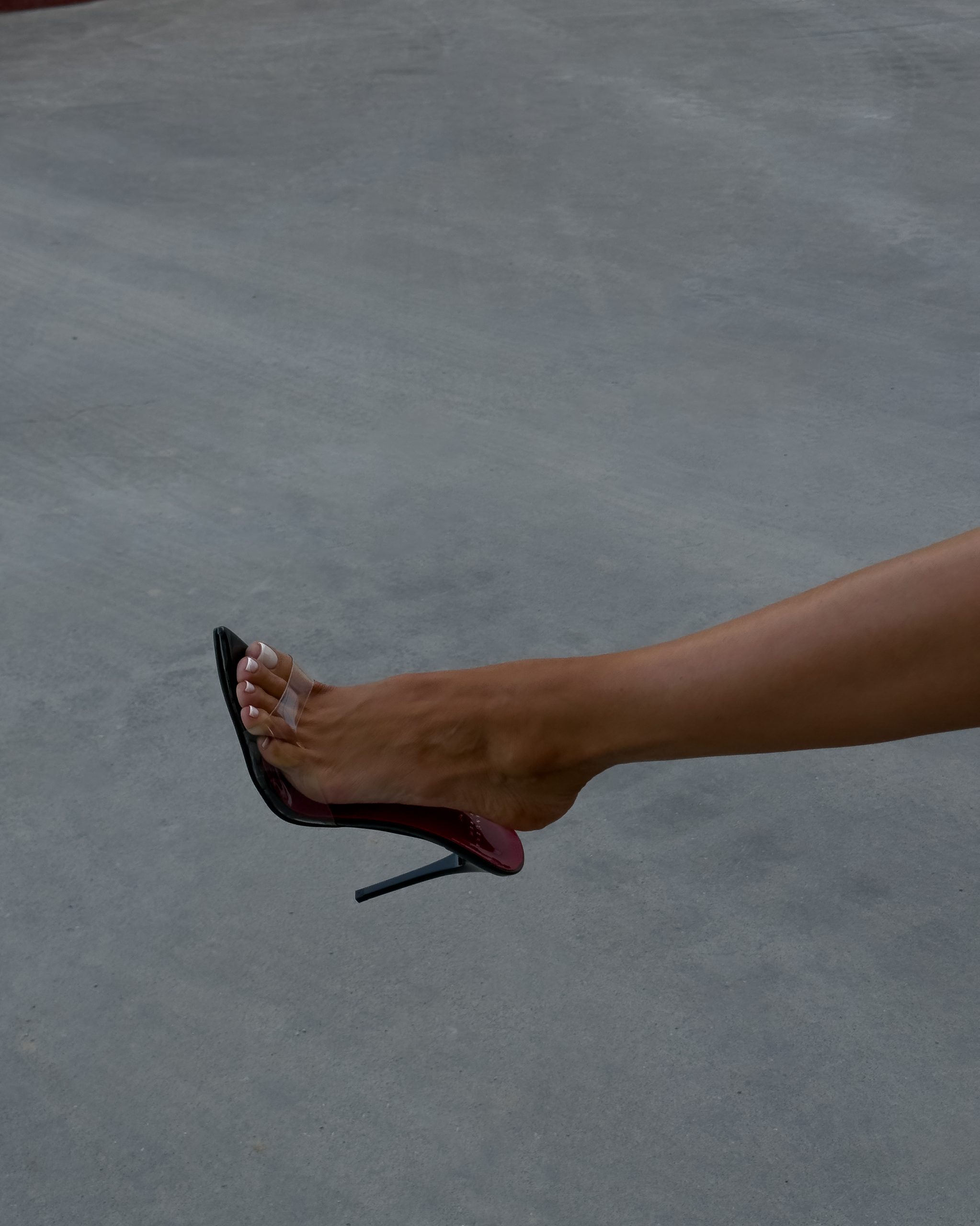 Μυτερό μαύρο mule, με διαφάνεια και κόκκινο πατάκι. Το απόλυτο sexy mule για τις βραδινές σας εμφανίσεις , που δεν θα περάσει απαρατήρητο.