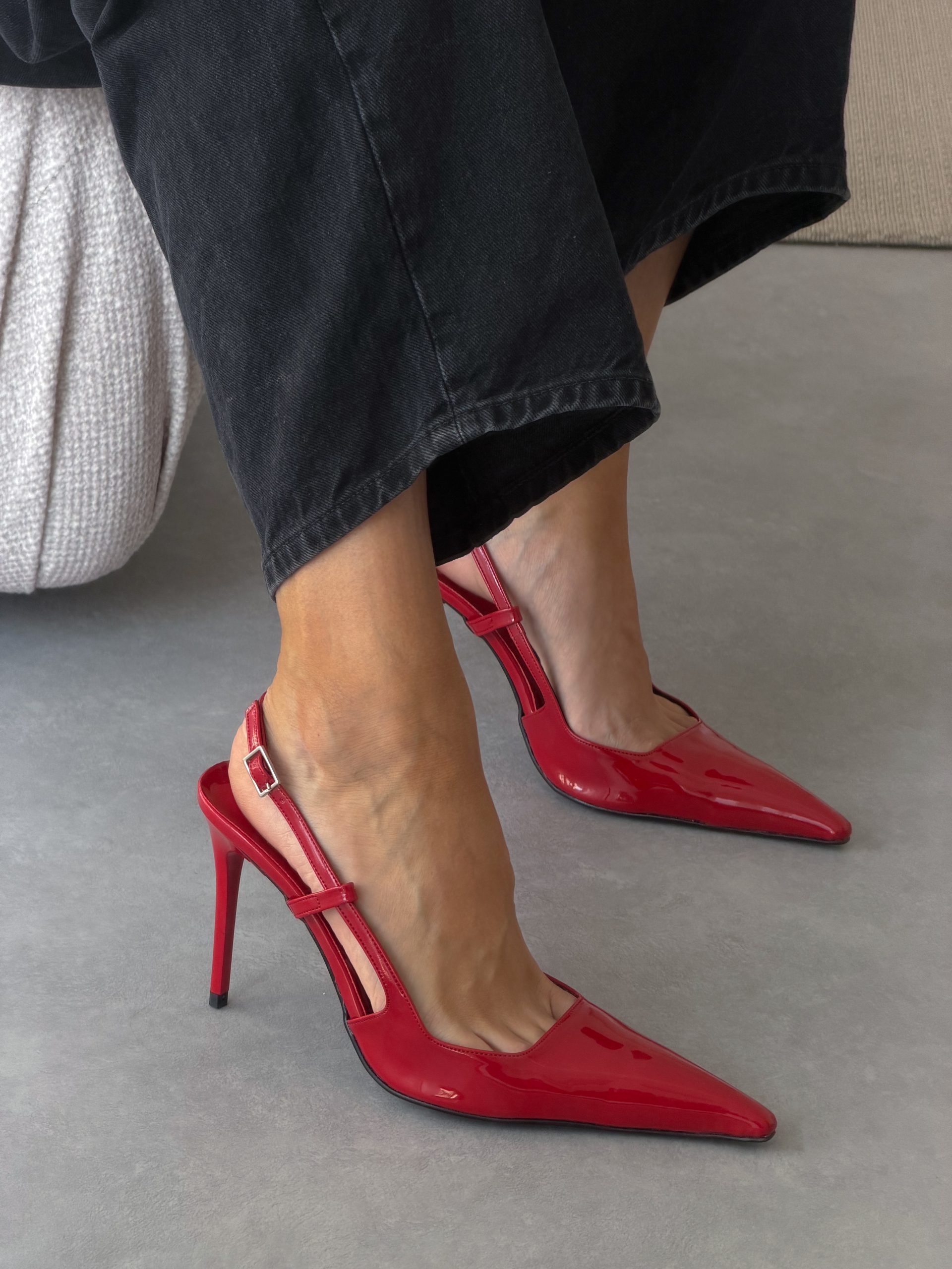 Μυτερό γοβάκι σε κόκκινο λουστρίνι , με ελαφρώς τεραγωνισμένη μύτη . Ιδιαίτερο τετραγωνισμένο κόψιμο μπροστά στα δάχτυλα και λουράκι αυξομείωσης .