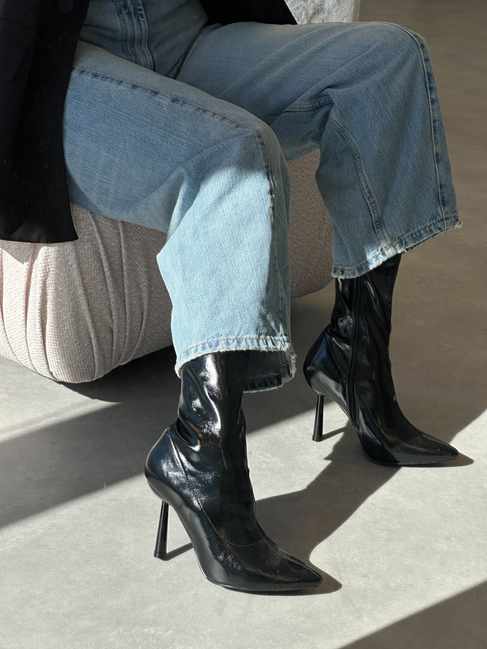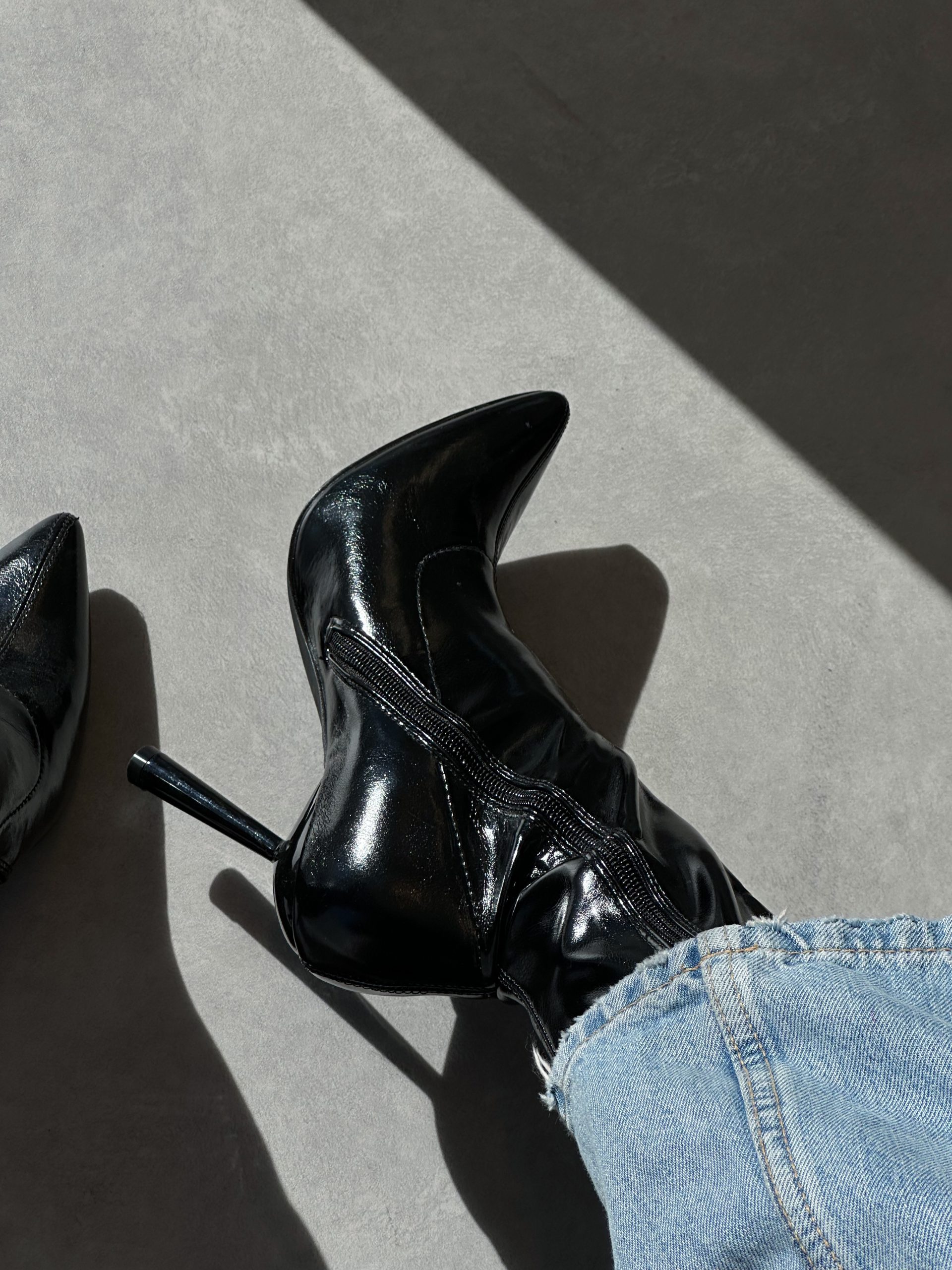 Μαύρο λουστρίνι μποτάκι , με τελείωμα πάνω από τον αστράγαλο . Διαθέτει φερμουάρ στην εσωτερική πλευρά και ύψος τακουνιού 9 εκατοστών.